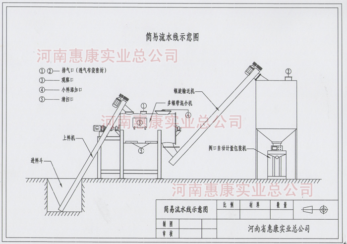簡易型流水線主要由螺旋上料機(jī)、多螺帶混合機(jī)、二次提升機(jī)、儲(chǔ)料倉、閥口自動(dòng)定量包裝機(jī)等組成。
