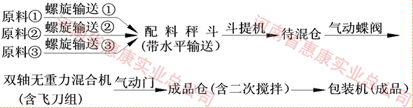 生產(chǎn)前只需將配方輸入智能化控制系統(tǒng)后,按一下啟動按鈕,程序自動完成原料的配比、物料的提升、攪拌,攪拌均勻后物料落入成品倉,進行自動定量灌裝。在第一批物料攪拌的同時,第二批次原料即被送入待混倉,以節(jié)省配料時間,最大程度的提高產(chǎn)能。