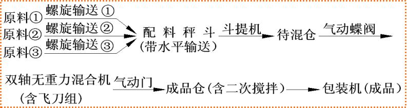 半自動(dòng)生產(chǎn)線,是在節(jié)能型生產(chǎn)線基礎(chǔ)上增加待混倉改進(jìn)而成。主機(jī)由雙軸無重力混合機(jī)換成單軸多螺帶混合機(jī)。其它配套設(shè)備有:斗式提升機(jī)、成 品倉(二次攪拌)、自動(dòng)定量包裝機(jī)(閥口式&敞口式)、鋼架平臺(tái)、空壓機(jī)、氣路系統(tǒng)、電氣控制柜等。