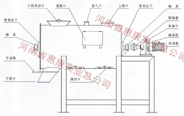 設(shè)備分內(nèi)外多層螺帶,筒身為圓形,通過攪拌軸的高速旋轉(zhuǎn),使內(nèi)外螺旋帶在較大范圍內(nèi)翻動物料,內(nèi)螺旋帶推動物料向兩側(cè)對流運(yùn)動,外螺旋帶推動物料由兩側(cè)向